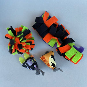 Halloween fleece forage strips for bedding, fleece strips for nesting and dig boxes.
