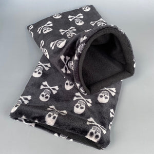 Skull and bones cuddle fleece snuggle sack, snuggle pouch, sleeping bag for hedgehogs and small pets.