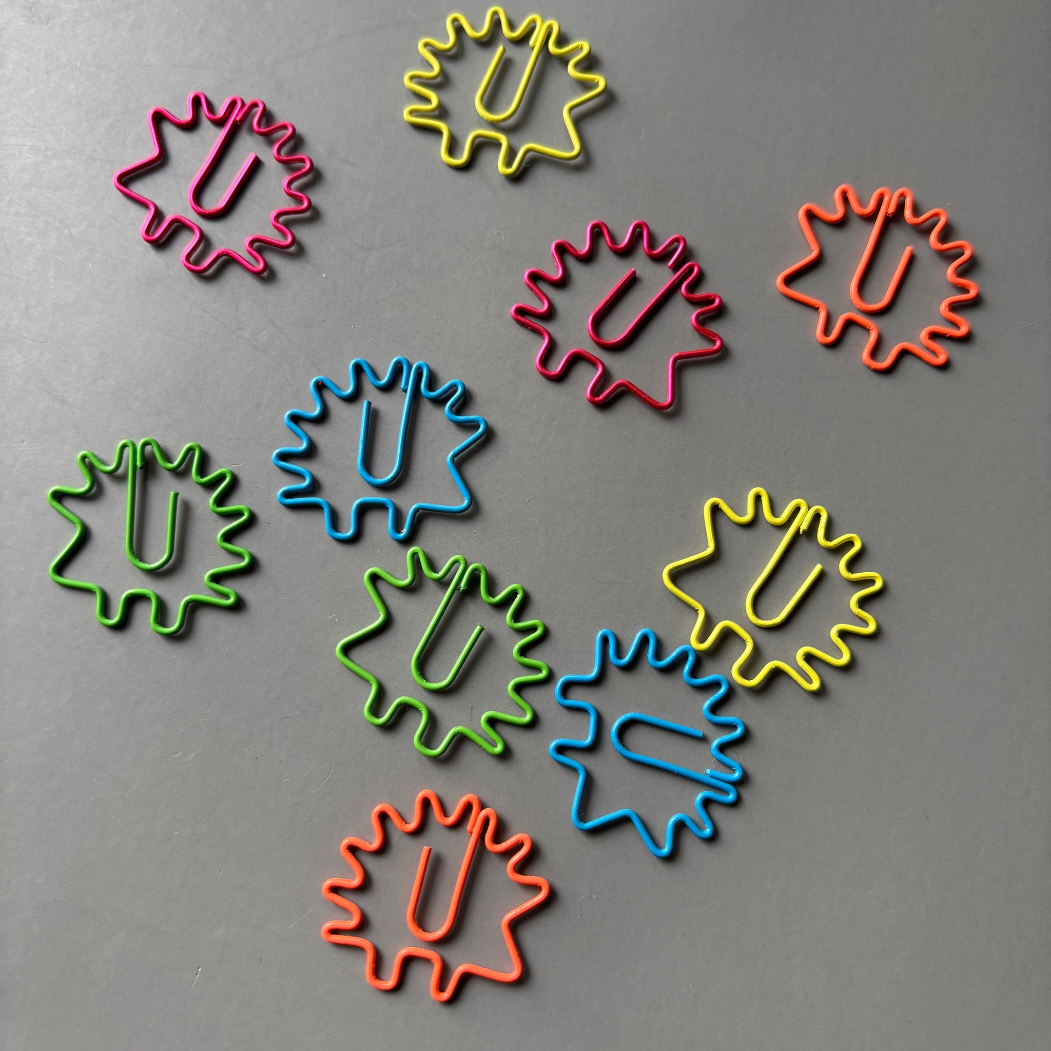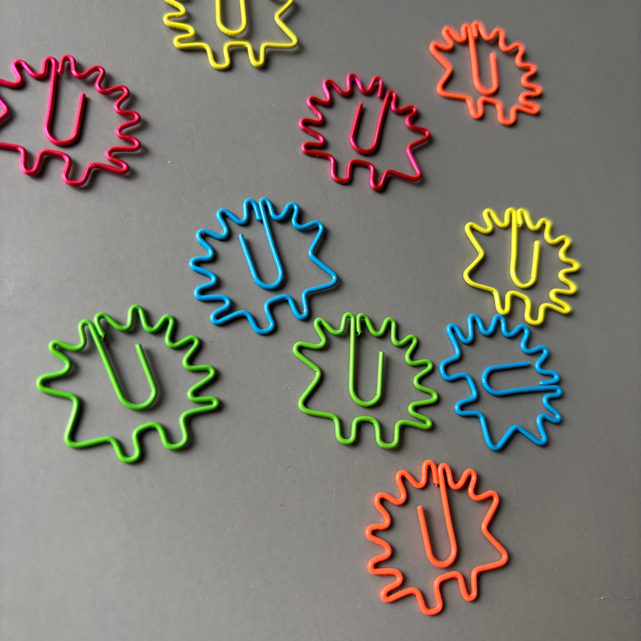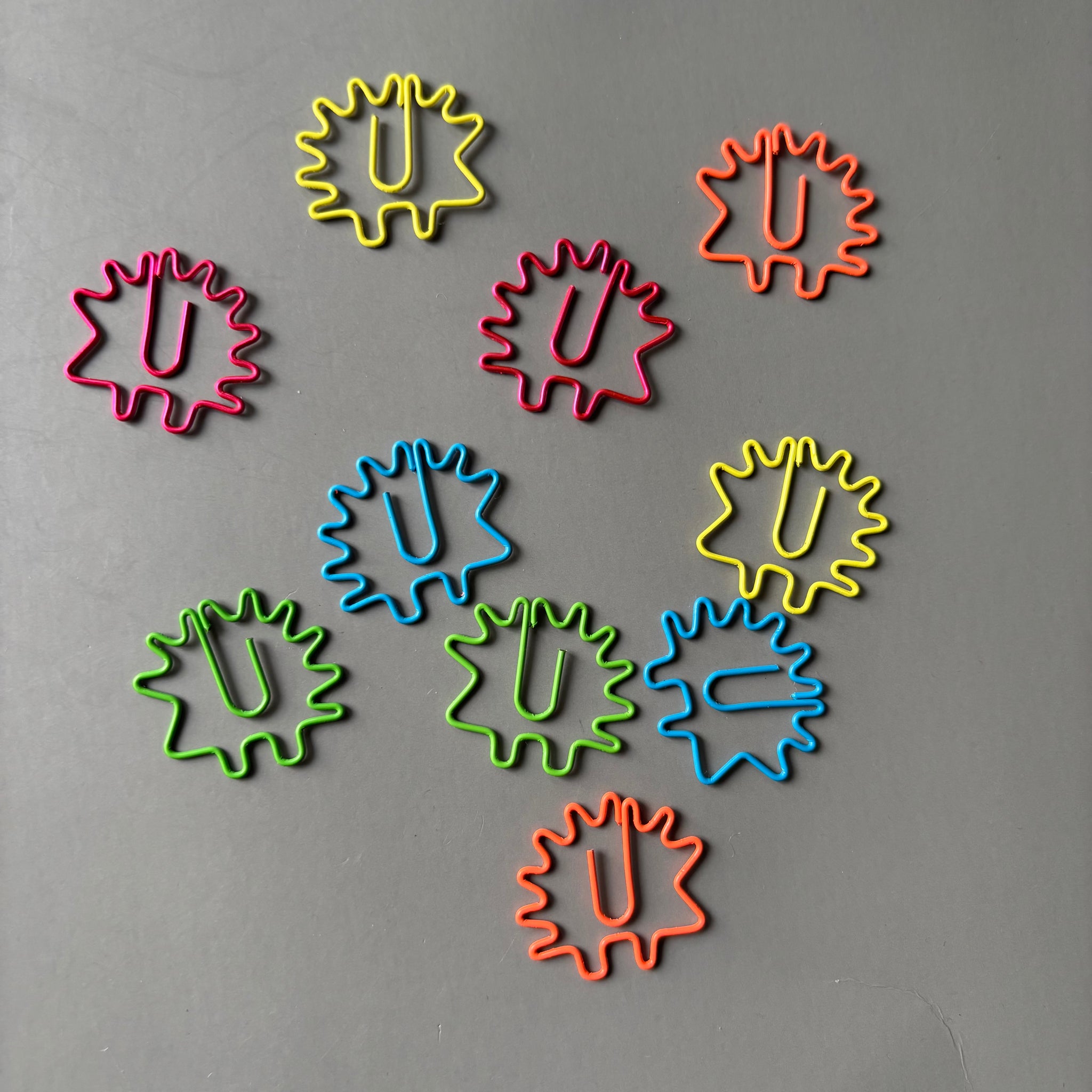 Hedgehog shaped metal paper clips used for organising documents, bookmarks and in planners. They feature a spiky hedgehog shape made from durable metal wire in assorted vibrant colours. They are lightweight, portable and designed not to damage paper easily.